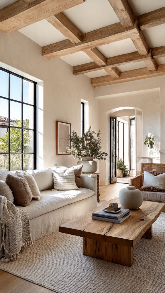A defining feature of modern Mediterranean living rooms is a soft, earthy color palette. Think warm whites, sand beige, soft taupe, clay, and muted stone tones. These shades reflect natural light beautifully and create a calm, breathable atmosphere.