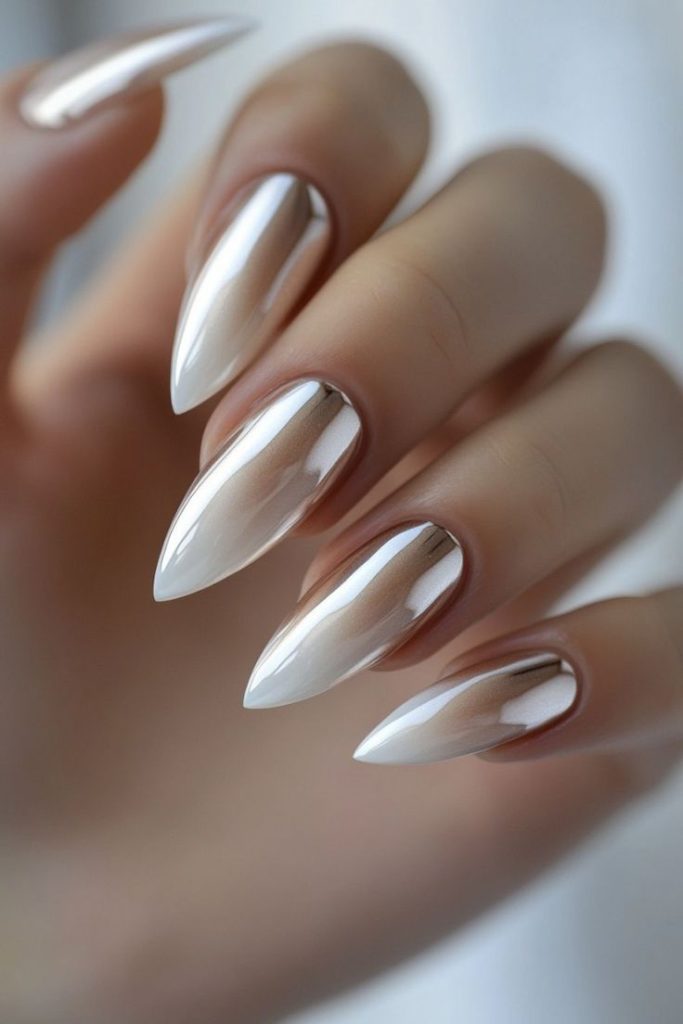 Chrome ombre nails combine soft color fades with a reflective finish. The metallic sheen adds depth and dimension, making the nails look sleek and futuristic without being too dramatic.