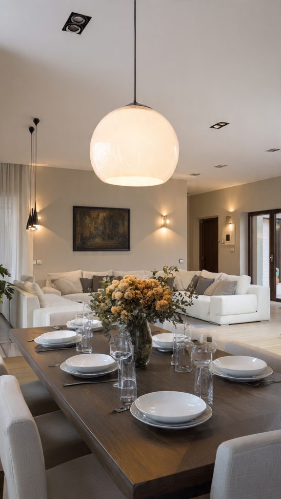 Lighting is one of the most overlooked zoning tools in open-plan design. A pendant light above a dining table, recessed lighting in the kitchen, and softer ambient lighting in the living area instantly establish purpose.
