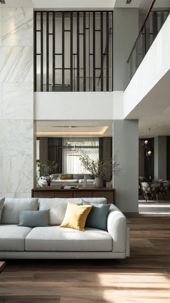 Material repetition—such as wood finishes or metal accents—helps unify the zones even as they differ.