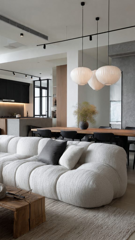 Varying furniture scale helps define zones organically. A large sectional may anchor the living area, while slimmer dining chairs keep the dining space visually lighter.