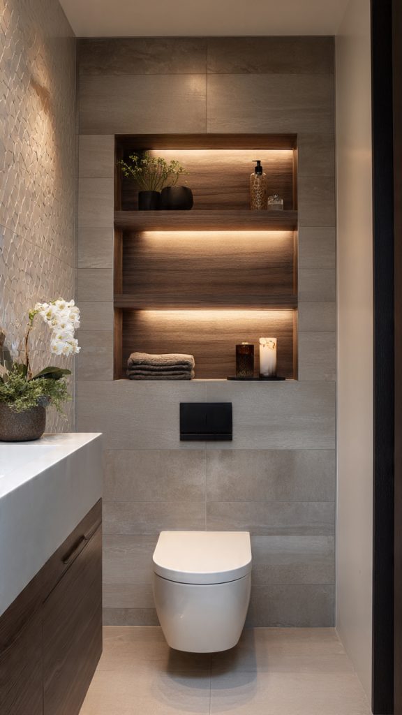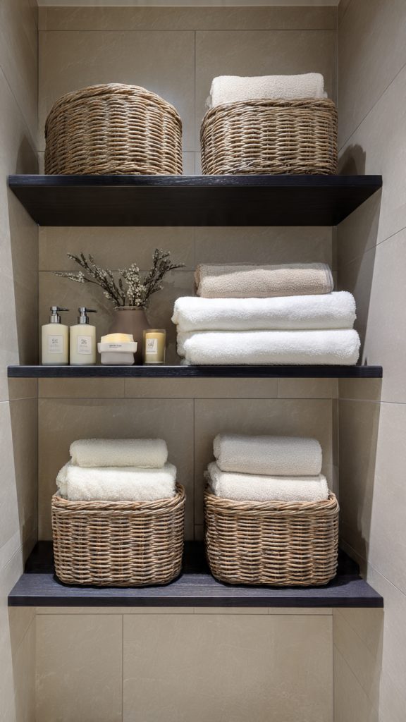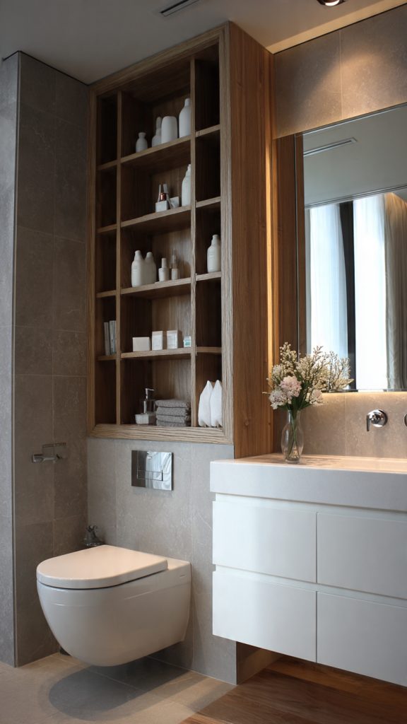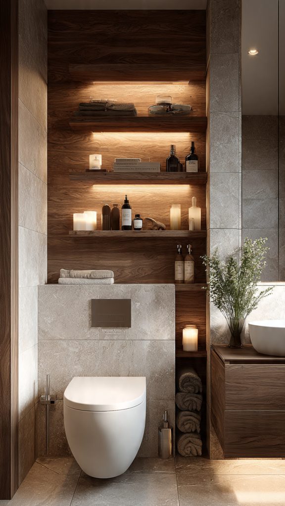 Open shelving can work beautifully when kept minimal. Designers use one or two floating shelves above the toilet, styled with towels, baskets, or simple décor.