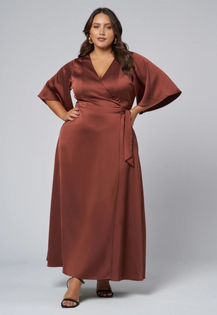 A satin wrap dress feels elevated without being restrictive. The wrap silhouette adjusts to your body, defining the waist while flowing over hips beautifully.