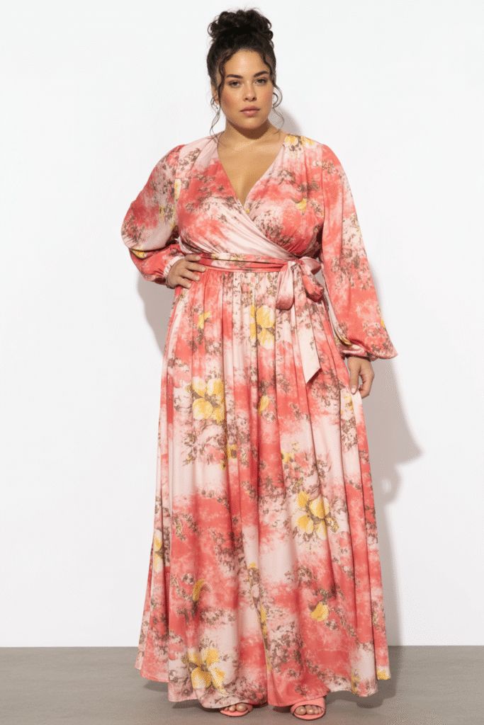A flowy maxi dress in a soft floral or watercolor print instantly feels wedding‑appropriate and romantic. The long silhouette glides over curves while creating an elegant, elongating line.