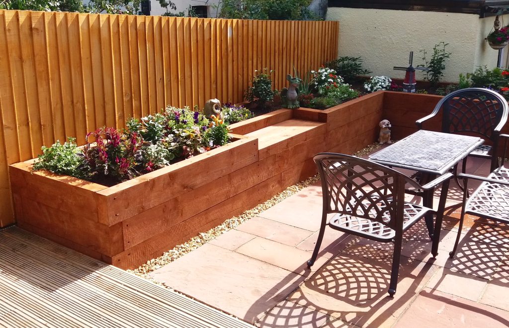 Mixed material raised beds showcase individuality and craftsmanship, making the garden feel custom-built and professionally styled.