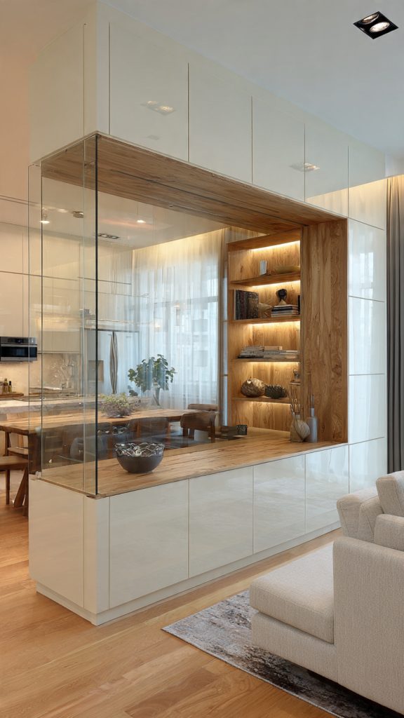 Glass dividers—especially with slim metal frames—create separation without blocking light. They’re ideal for dividing workspaces, dining areas, or bedrooms while keeping the room visually open.