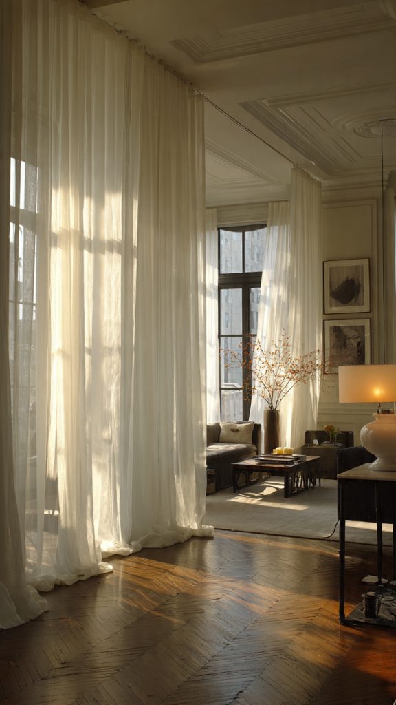 Curtains don’t have to feel makeshift. When mounted ceiling-to-floor on proper tracks or rods, they create a soft yet intentional division.