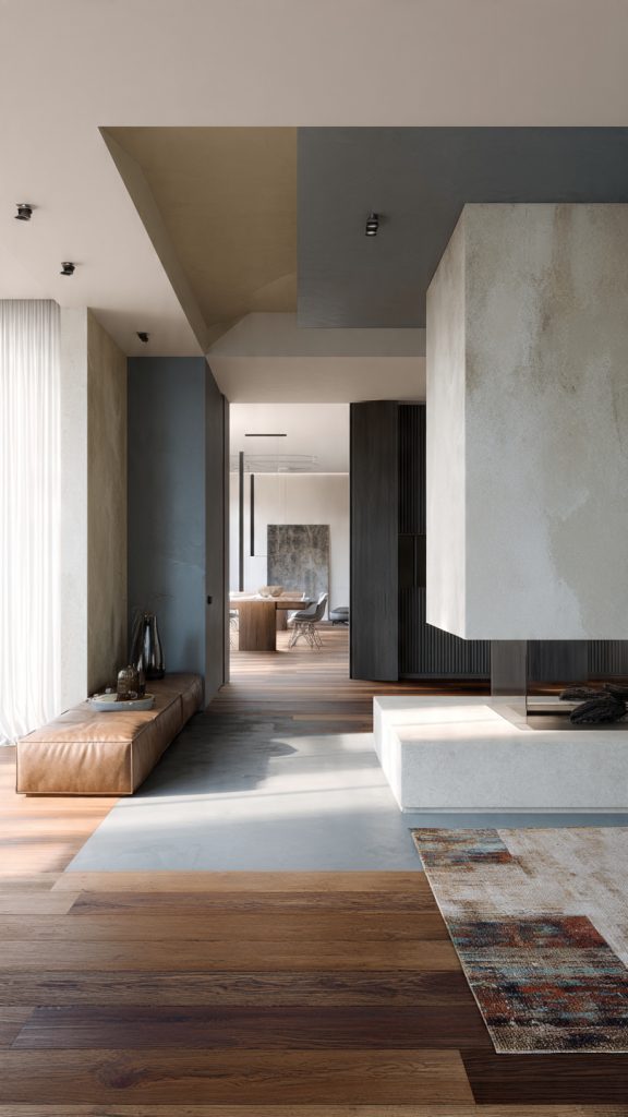 Sometimes the most stylish dividers are invisible. Changes in flooring, ceiling treatment, or wall finishes subtly define zones without adding physical barriers.