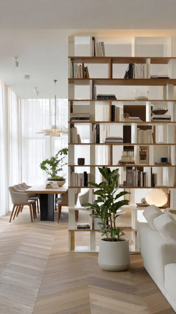 Open shelving is one of the most versatile and design-forward ways to divide a room. It creates separation while allowing light to pass through, keeping the space open and connected.