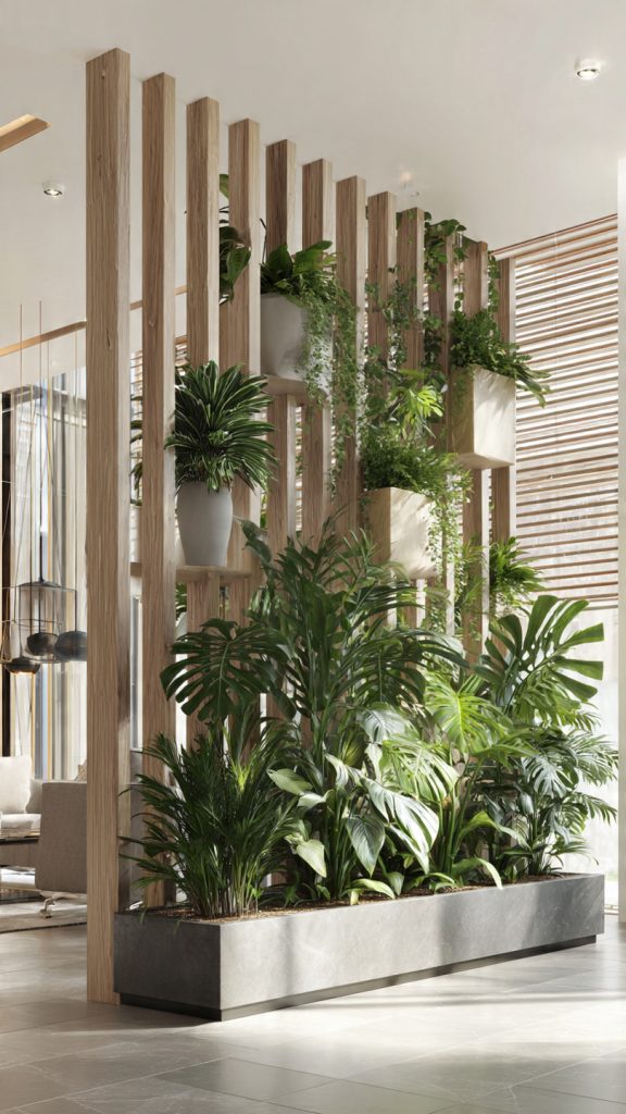 Large plants or grouped greenery can act as natural dividers. Tall plants, planters, or plant walls define zones while bringing life into the space.