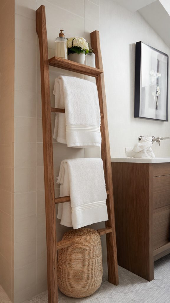 A leaning ladder or ladder-style rack offers vertical towel storage with minimal footprint. Designers use these as both functional and decorative elements.