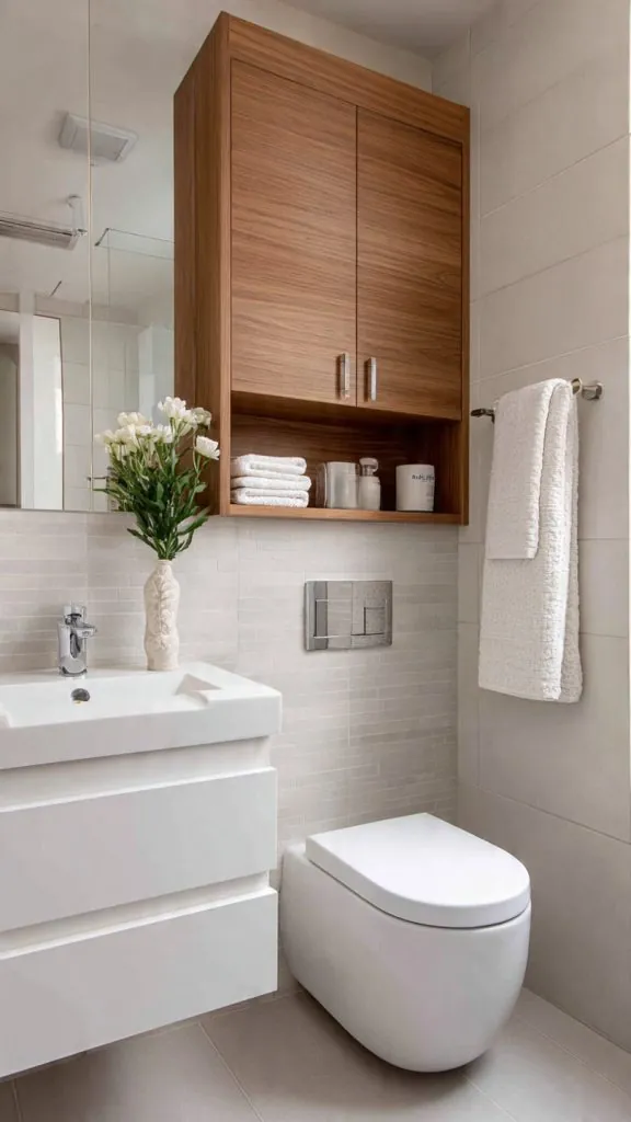 The wall above the toilet is one of the most underused areas in a bathroom. A slim wall-mounted cabinet or closed shelving unit adds storage without taking up any floor space.