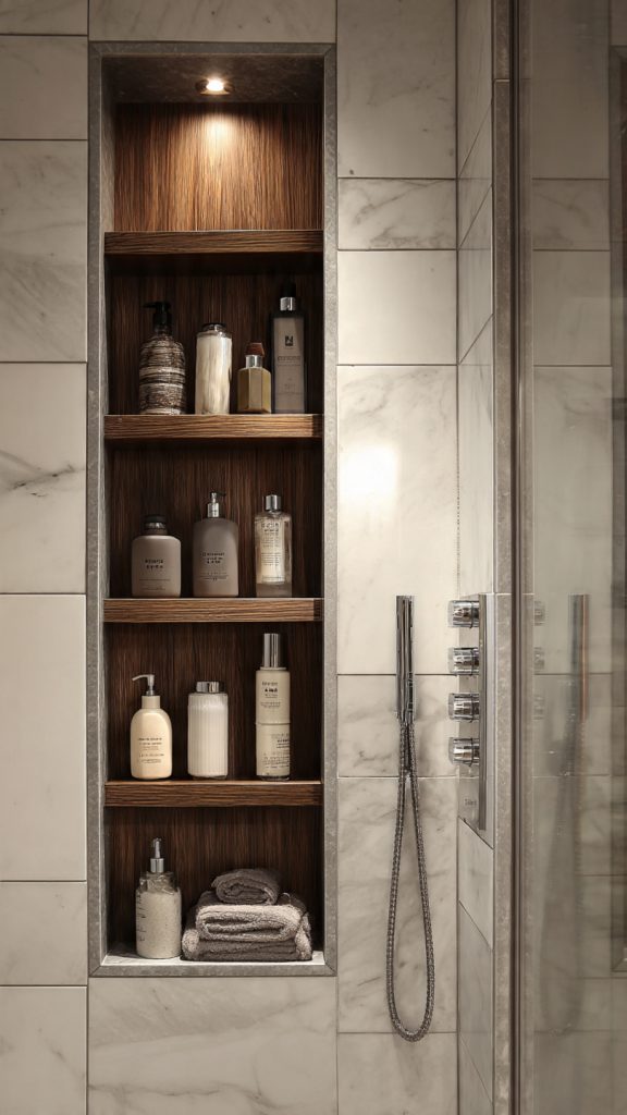 Recessed vertical niches provide storage without protruding into the room. Designers often install tall niches for bottles, towels, or décor.