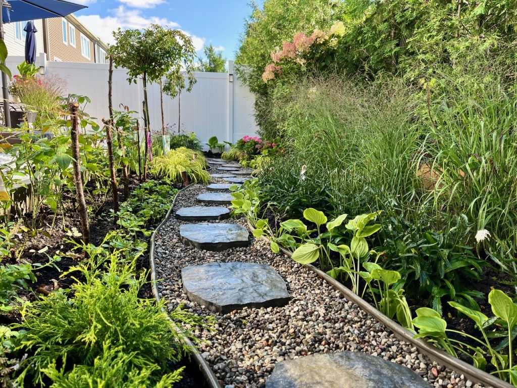 Why It Works: Stones anchor the garden visually, create a tactile experience underfoot, and complement surrounding plantings without overwhelming a small space.