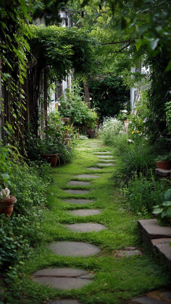 Why It Works: Grass paths are eco-friendly, reduce hardscape, and give the garden a relaxed, lush appearance without adding extra materials.