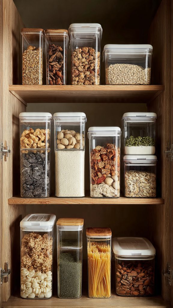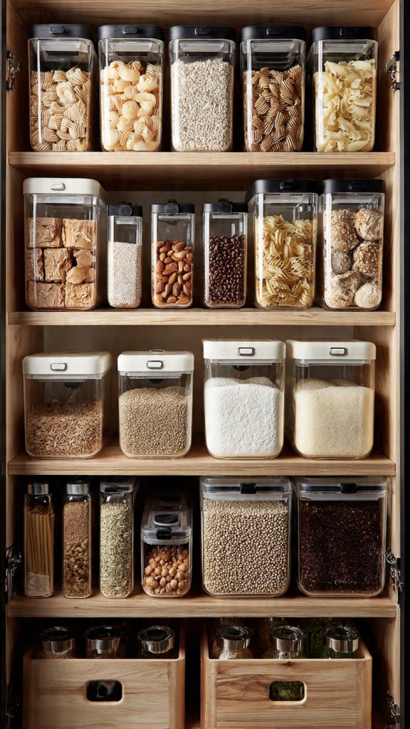 Original packaging wastes space and creates visual clutter. Designers decant pantry staples into stackable containers sized specifically for cabinets.