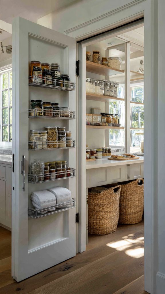 The inside of cabinet or closet doors is valuable pantry real estate. Slim racks or mounted organizers can hold spices, snacks, or small items.