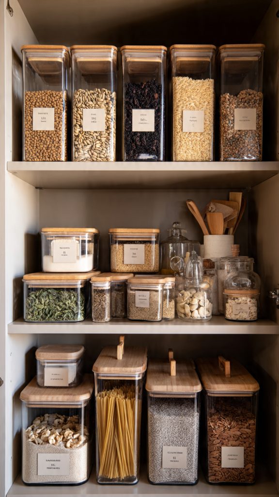 Uniform containers make small pantries feel intentional.