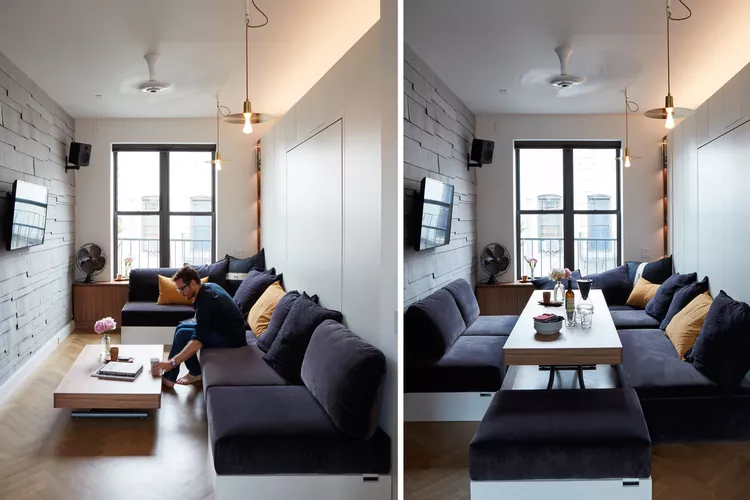 The key is committing fully to the system. Once the bed is hidden, the remaining furniture should be arranged like a true living room, not a compromise.