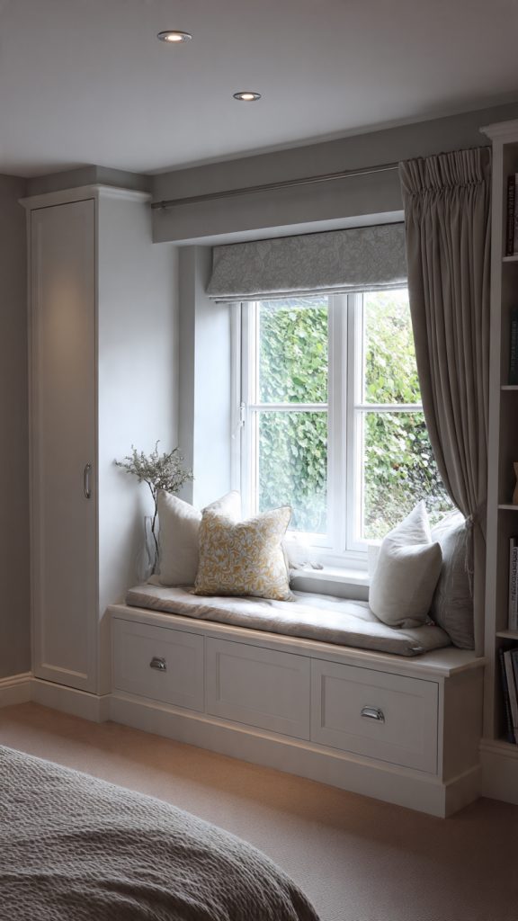 In bedrooms, window seats often replace extra furniture. Designers use them as seating, storage, and even a vanity perch.