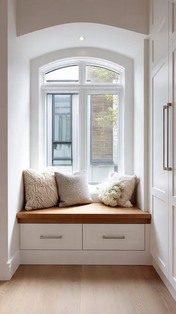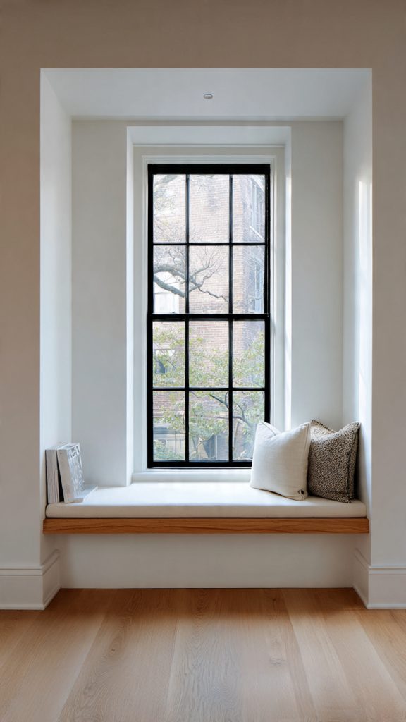 Even shallow window seats can be functional. Designers create narrow seats with slim cushions and minimal storage to suit small bedrooms or hallways.