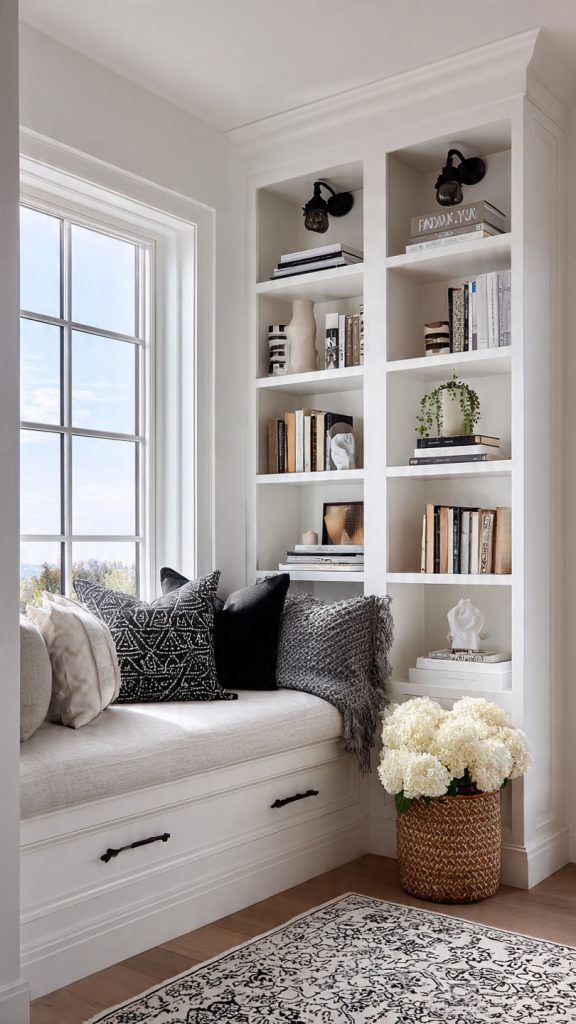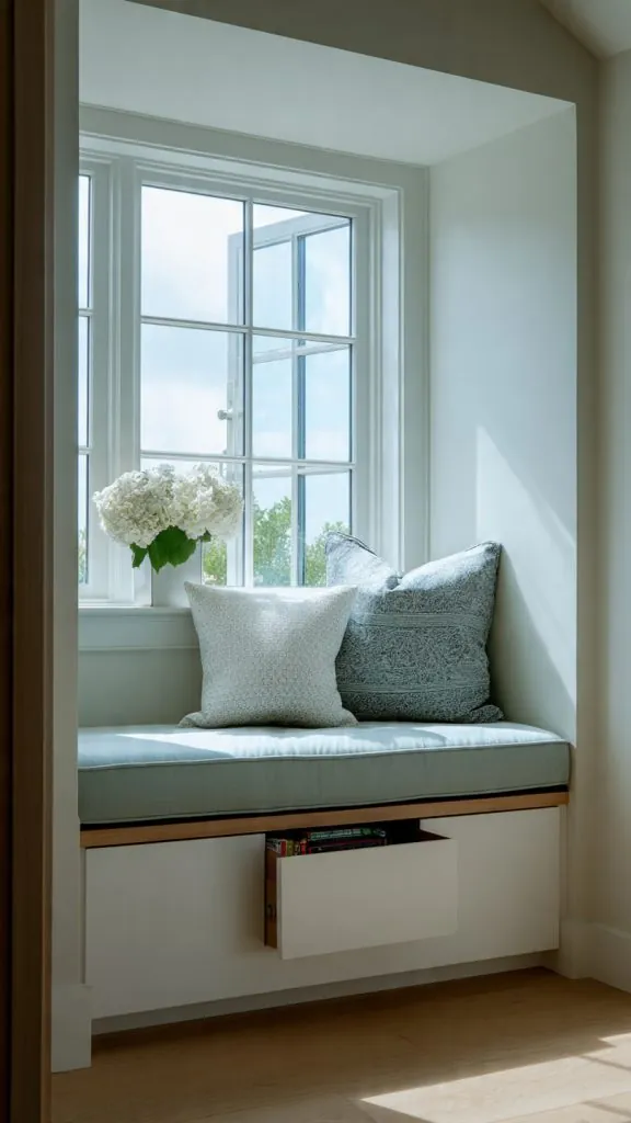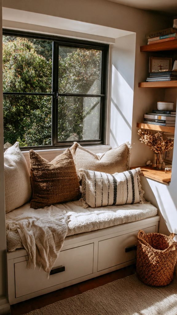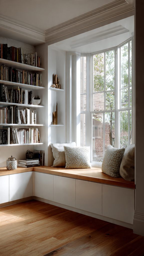 Designers often turn window seats into reading nooks by adding pillows, throws, and integrated storage for books underneath.