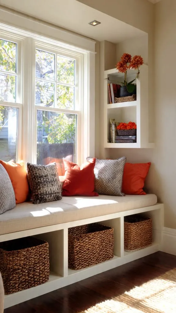 Open cubbies beneath a window seat feel casual and functional. Designers use them for baskets, books, or decor to add texture and warmth.