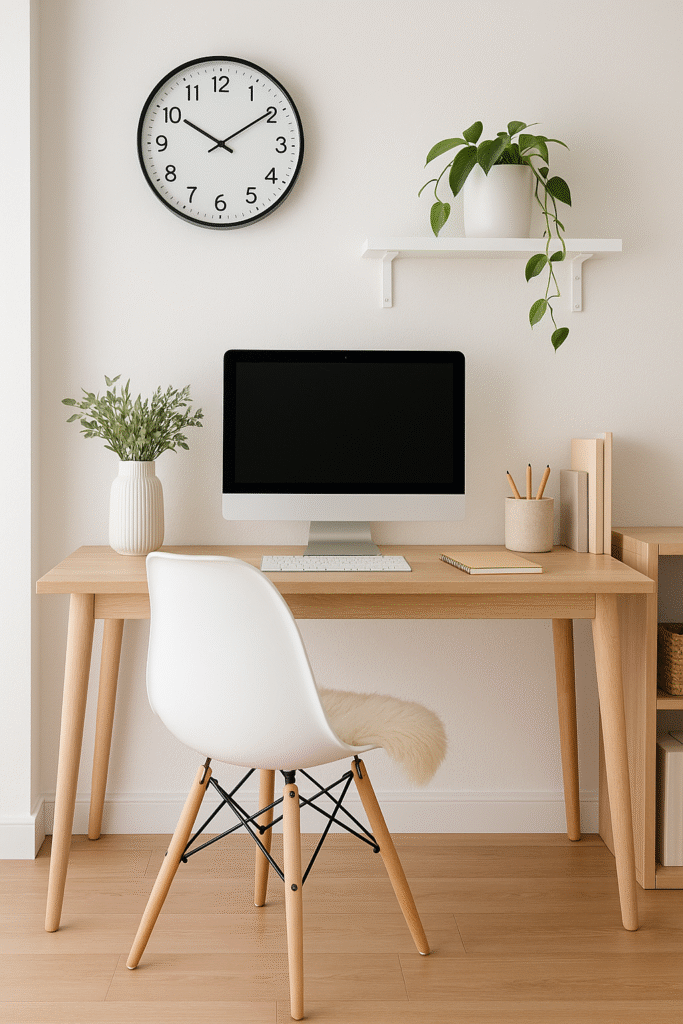 The Scandinavian design approach is all about simplicity and functionality. White walls, light wood furniture, and soft neutral tones make the space feel calm and balanced. Add a sheepskin rug or cozy throw over your chair for comfort. The natural light and simplicity will help keep your mind clear and focused.