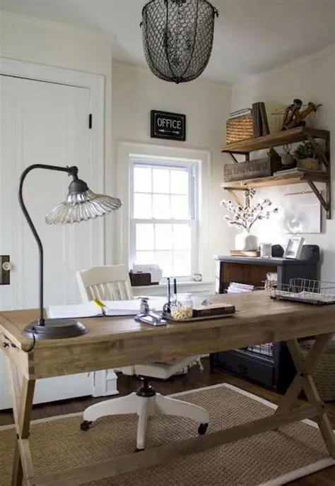 Love cozy, country-inspired charm? Try a farmhouse-style home office. A reclaimed wood desk, woven baskets, and neutral textiles make the space feel inviting. Add soft lighting, cozy throws, and vintage accessories for a warm, lived-in atmosphere.