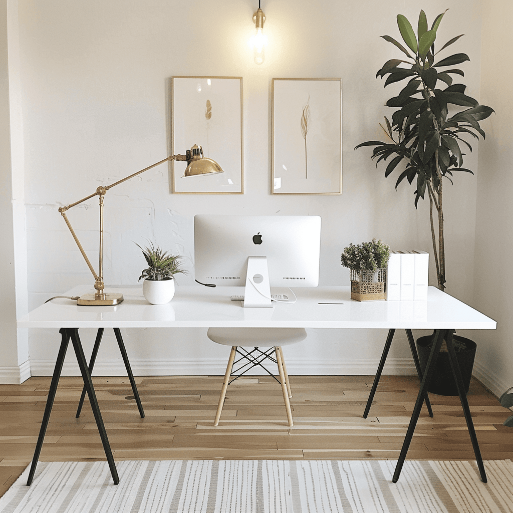 If you love clean lines and clutter-free spaces, a minimalist home office is perfect. Choose a sleek white desk, a simple ergonomic chair, and metallic accents in gold or silver for a touch of glamour. Add a single potted plant or framed quote for personality. The goal is to keep distractions minimal while maintaining a fresh, airy feel that enhances focus.