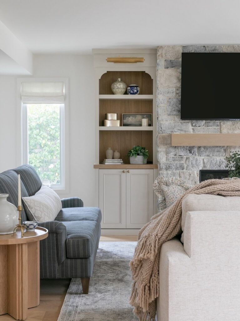 Light, neutral furniture keeps the room airy and inviting. The two white sofas frame the space beautifully, offering a clean foundation for the layered beige and taupe pillows that make the room feel lived-in and serene. The round accent chair adds sculptural shape and natural wood detail, grounding the room without weighing it down.