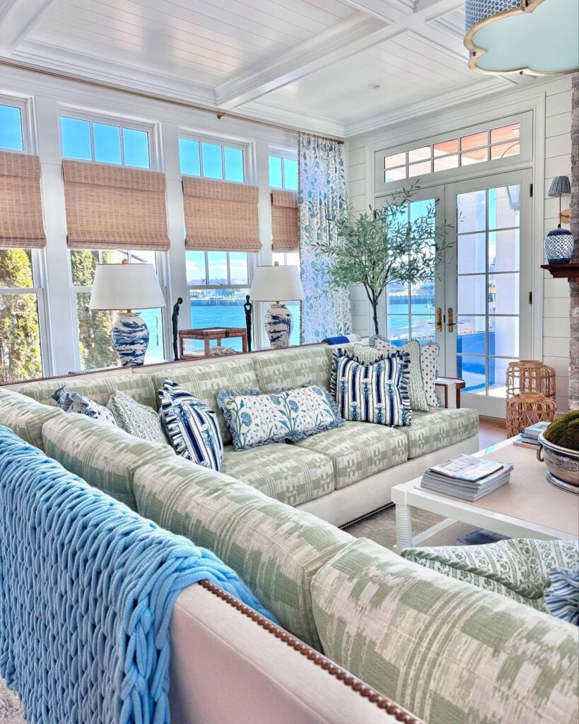 A vibrant mix of patterns and blues gives this living room a cheerful coastal personality. Blue-and-white pillows, fresh textiles, and panoramic water views create the perfect backdrop. The design uses traditional coastal color schemes but updates them with playful, modern fabrics.