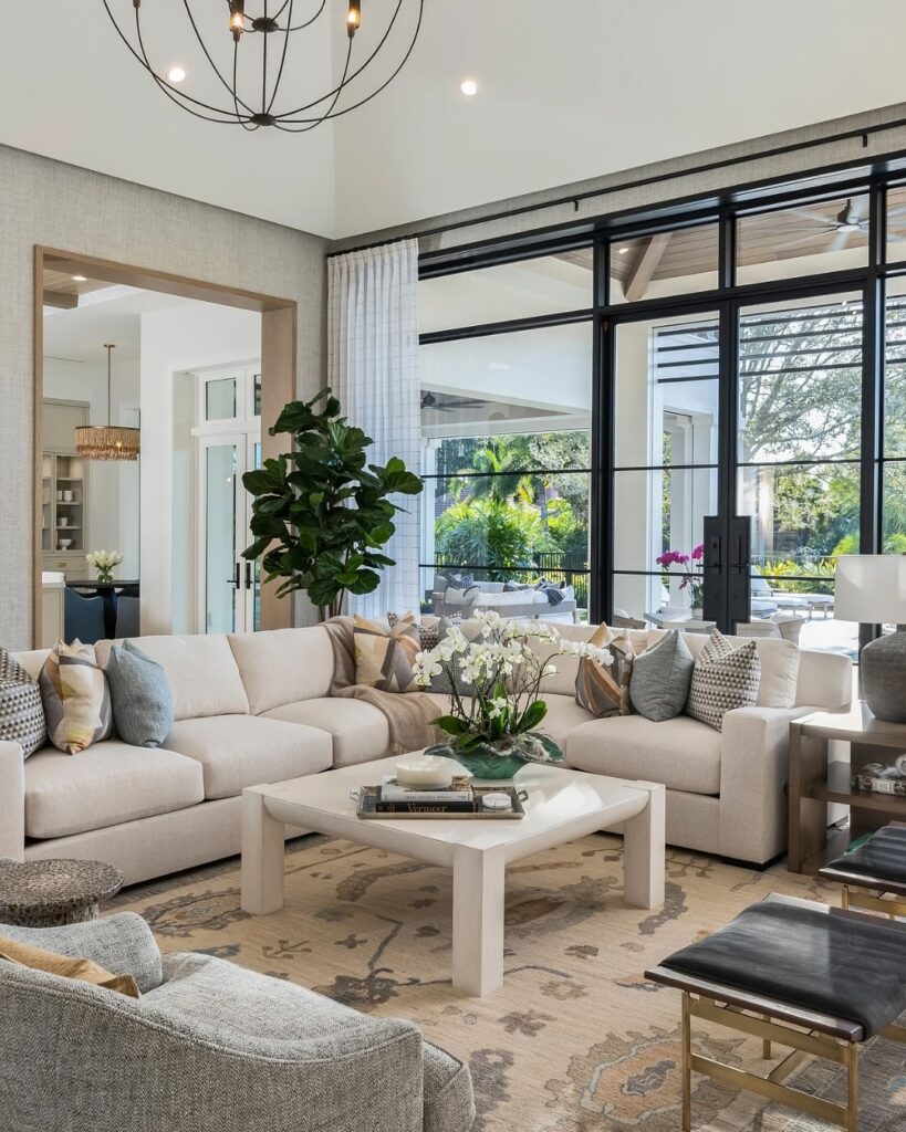 Large windows and sliding doors flood the room with natural light, allowing greenery and sky to become part of the design. Plush sofas, soft textiles, and neutral tones create an inviting, breezy atmosphere. This is the heart of modern coastal style—calm, open, and connected to the outdoors.