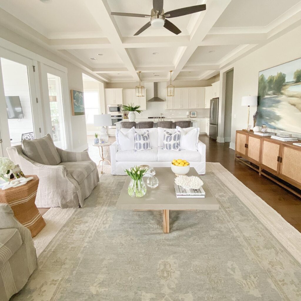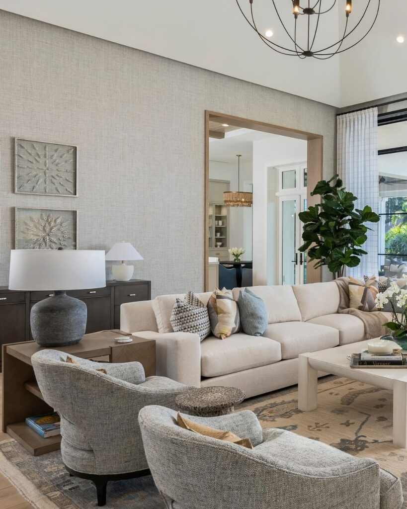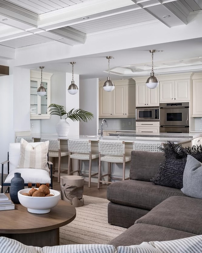 This open-concept space blends coastal comfort with modern elegance. Light cabinetry, natural wood, white counters, and palm stems bring subtle beachy influences while keeping the space sophisticated. The textural pillows and warm upholstery tie into the soft coastal palette. It’s perfect for those who want a high-end coastal feel.