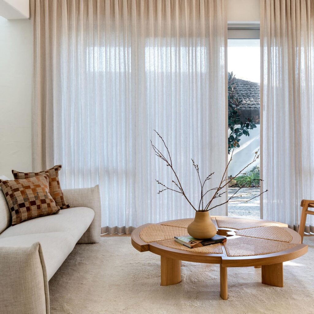 This design celebrates sunlight. Floor-to-ceiling sheer curtains let light diffuse softly into the room, and a round wood coffee table anchors the space with natural texture. The look is clean, uncluttered, and organic—perfect for a modern coastal vibe that leans toward minimalism. The mix of creamy tones and warm wood brings instant calm.