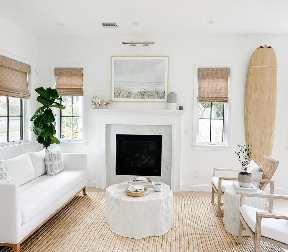 Bright, white, and serene, this living room uses flexibility and simplicity to deliver a pure coastal vibe. White seating, a textured coffee table, and woven blinds create a balanced look. The board leaning in the corner adds a gentle beach reference without overwhelming the room. This is the ideal layout for smaller spaces seeking a fresh coastal look.