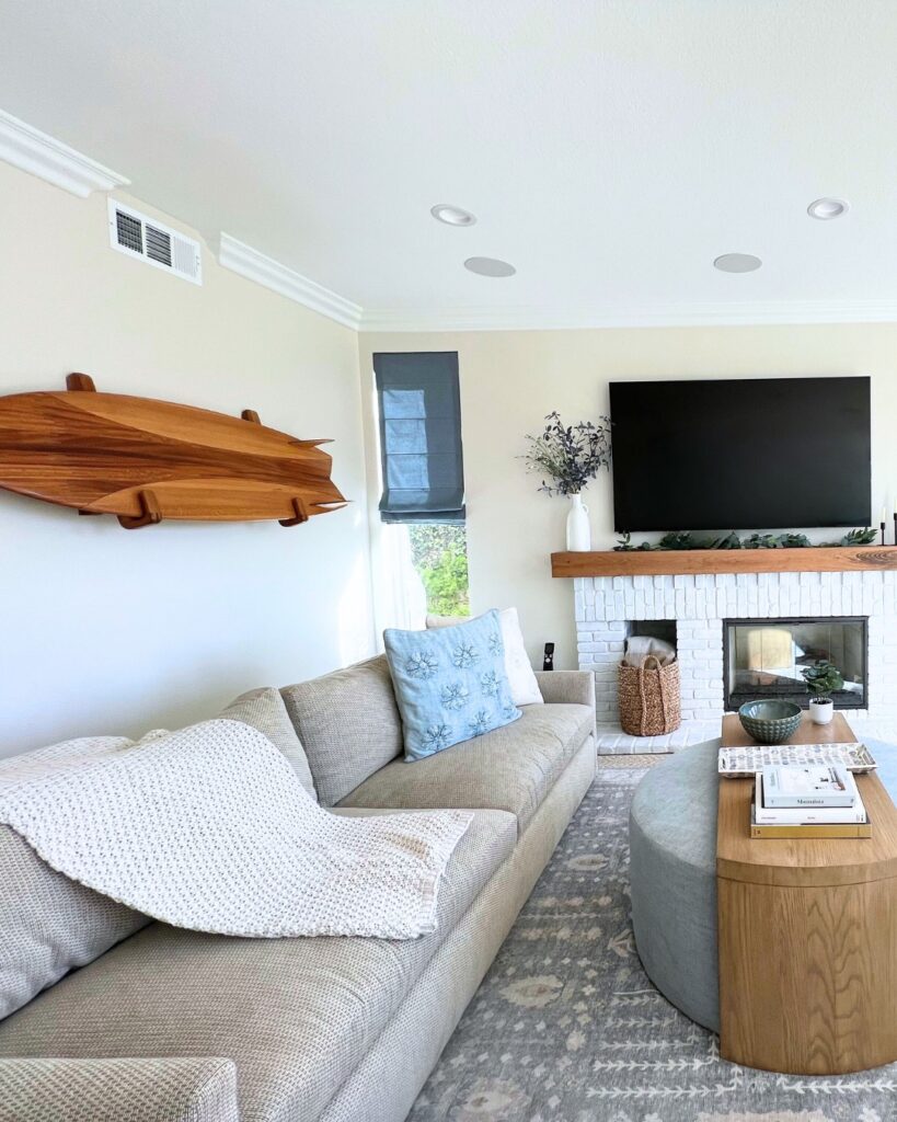 The first look blends a sandy-toned sofa with soft blue accents, instantly creating an airy beach house mood. Natural textures in the knit throw, woven rug, and wooden surfboard give the room warmth while keeping the palette calm. This space proves that you don’t need bold color to express a coastal lifestyle—light neutrals and subtle blue undertones do all the work.