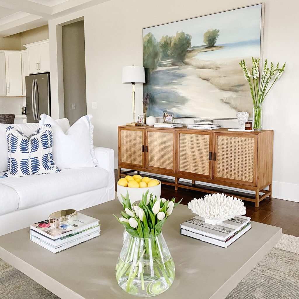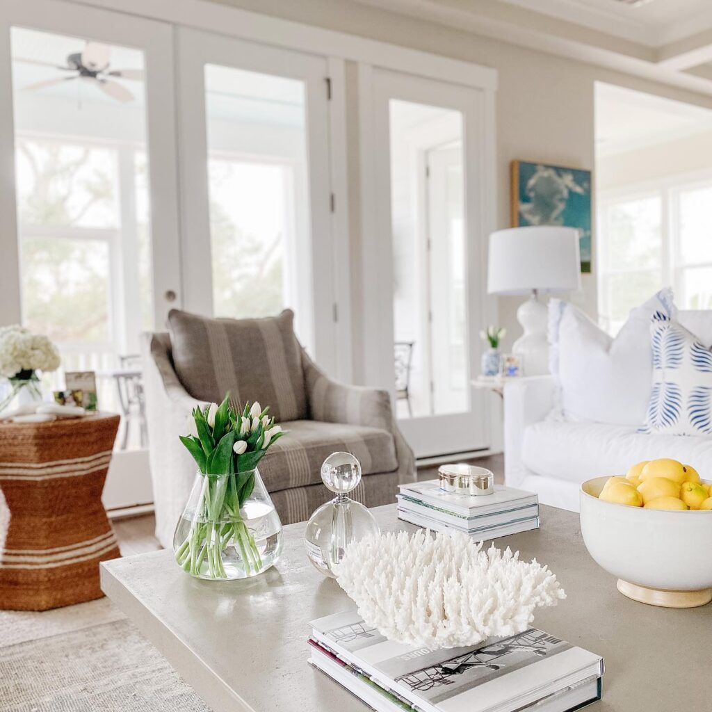 Create a coastal coffee table tray using simple items like shells, candles, driftwood, or a small vase of greenery. It’s an effortless way to style the room seasonally.