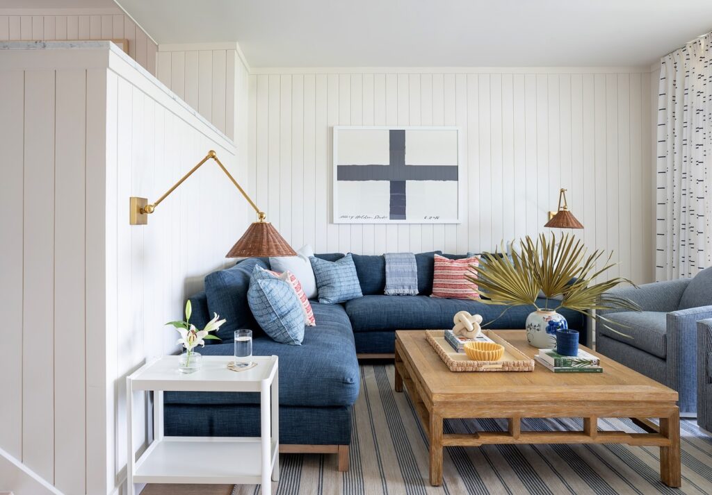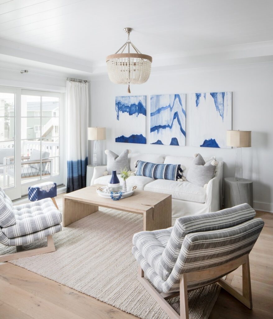 This coastal living room uses rich blues strategically—on chairs, pillows, and artwork—to build a crisp, ocean-inspired palette. The bleached wood coffee table and light floors keep the overall look bright. It’s a perfect mix of classic coastal and modern sophistication.