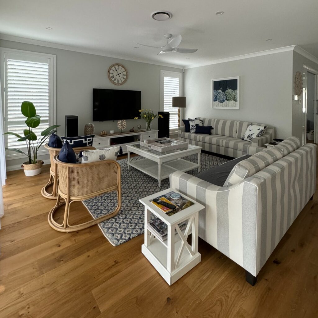 The striped sofas and rattan chairs immediately create a breezy coastal mood. Natural wood floors, blue-toned pillows, and an airy layout keep things informal and inviting. This look is perfect for family-friendly coastal spaces where comfort comes first without sacrificing style.