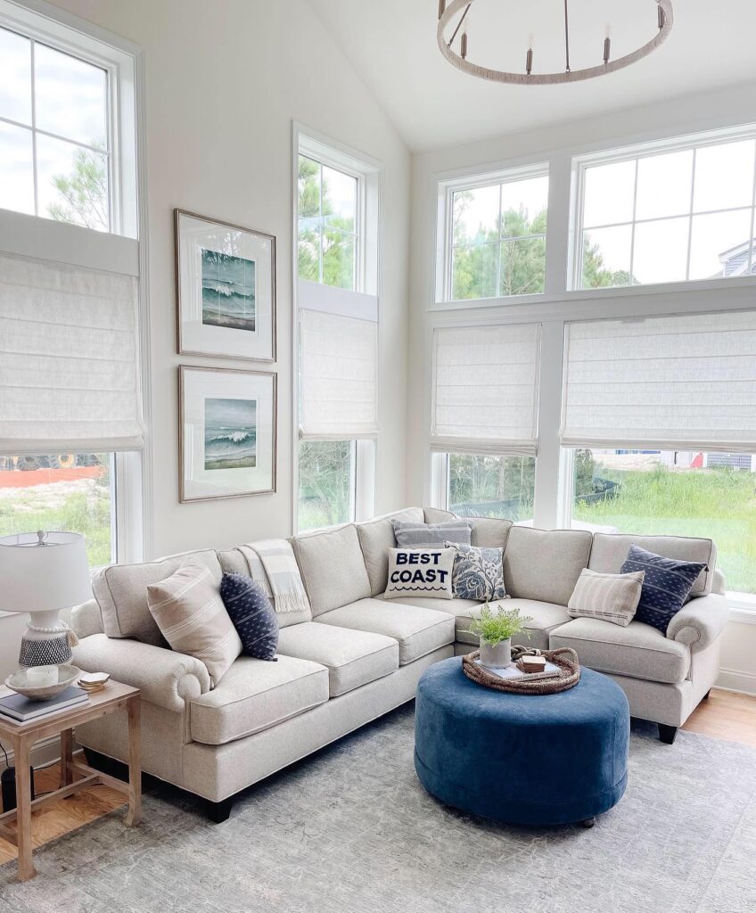 The corner sectional, blue pouf, and framed ocean artwork give this room a relaxed beach-house personality. Tall windows invite plenty of light, enhancing the soft palette. The mix of sandy tones and soft navy accents is timeless for coastal design.