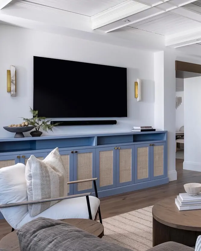 Here, the coastal story is told through color. The media cabinet painted in a muted ocean blue becomes the room’s anchor. The woven panel inserts add natural texture and mimic sandy tones. Paired with soft pillows and pale flooring, the space strikes a beautiful balance between coastal charm and clean contemporary style.