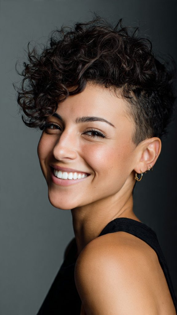 Let natural curls flourish on top while the sides are buzzed, emphasizing volume and texture against the clean shave.