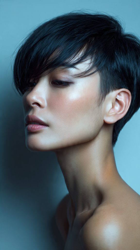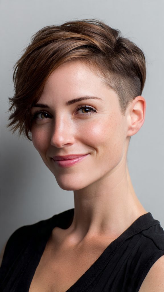 Create a deep side part that reveals one fully shaved side, while the other side remains pixie-short and hidden.