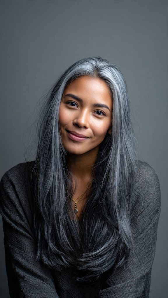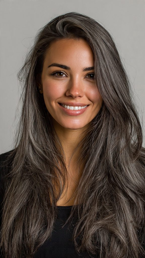 Transition from dark brown roots to a mid-length charcoal grey, ending in icy silver tips—this gradual ombré grows out flawlessly and works with any grey percentage.