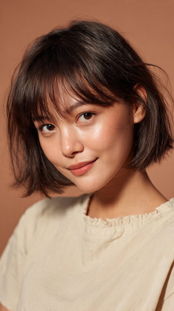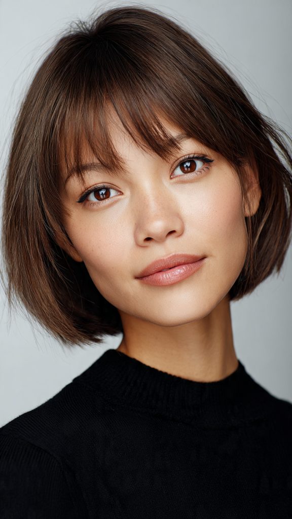 Adding short, choppy curtain bangs that blend into the bob’s layers removes weight from the front hairline, boosting volume where fine hair needs it most.