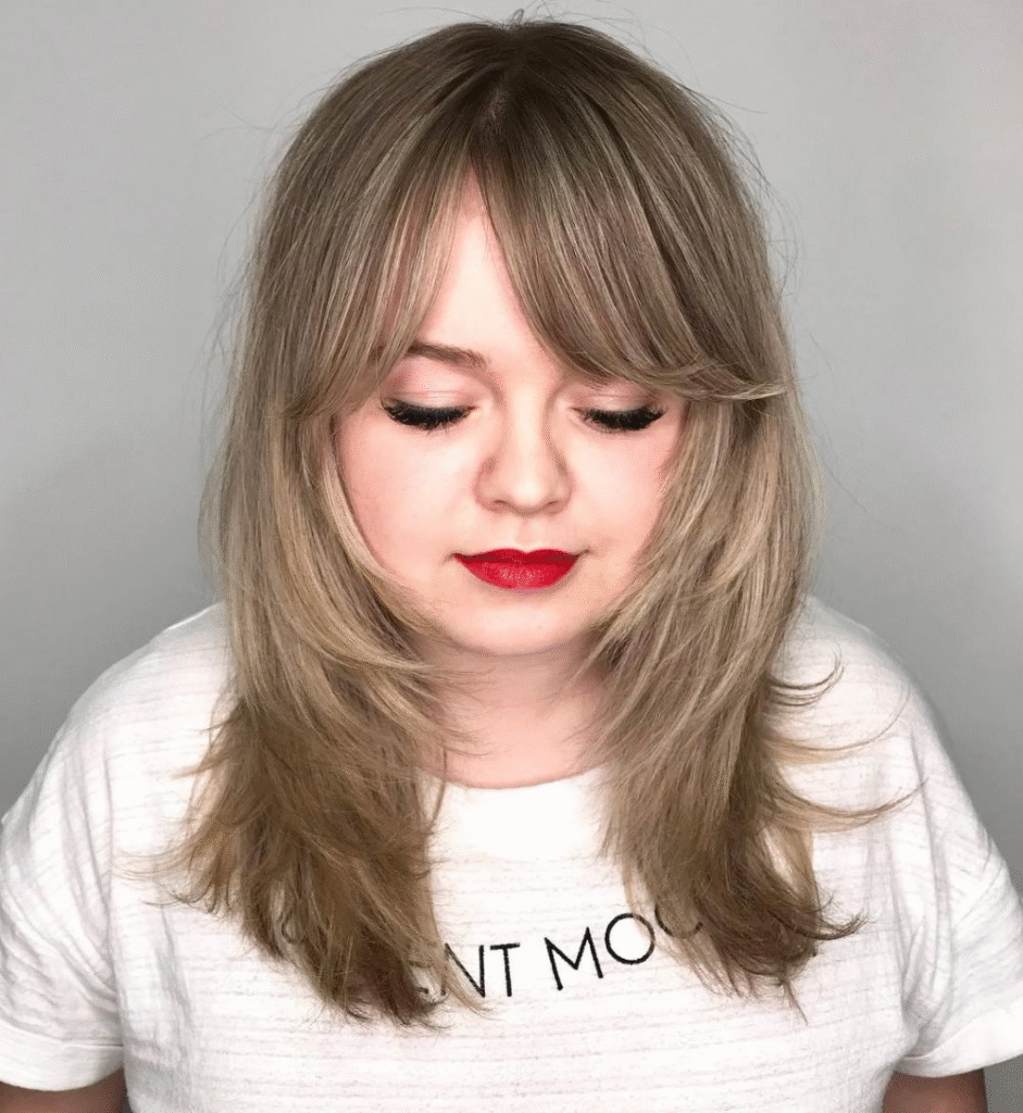 Side-swept bangs are a perfect trick for visually elongating a chabby face. By covering part of the forehead diagonally, they create sharp angles and frame the eyes. Keep them soft and slightly feathered for a natural finish.