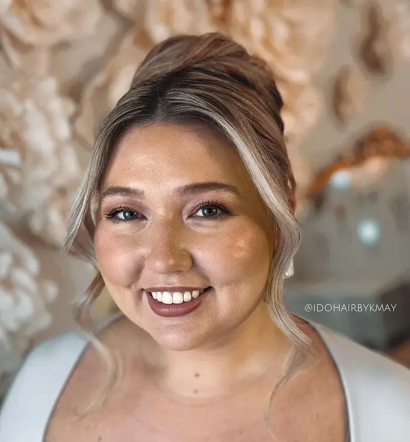 A low or mid-height messy bun paired with wispy strands around the face creates a slimming contour effect. For a soft, romantic vibe, use a curling wand to add slight bends to the loose strands.