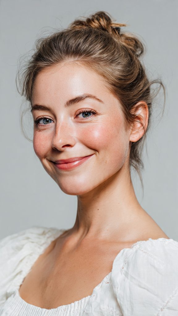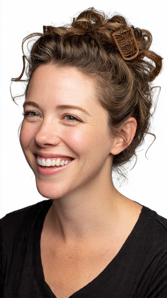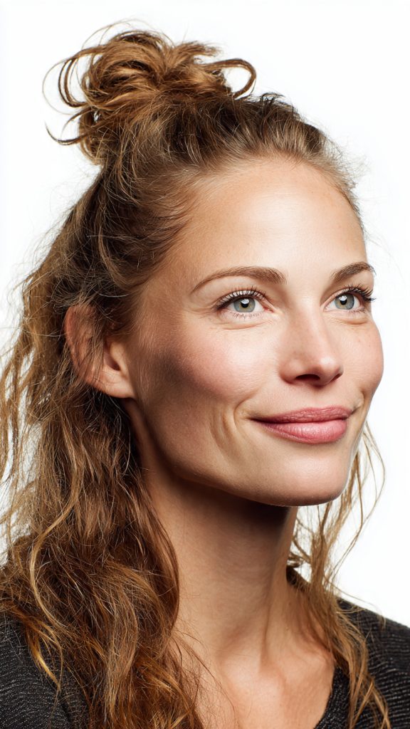 Pull the top half of your hair into a small bun on your crown, leaving the rest down—it lifts your face instantly and keeps hair out of your eyes during a hectic morning.