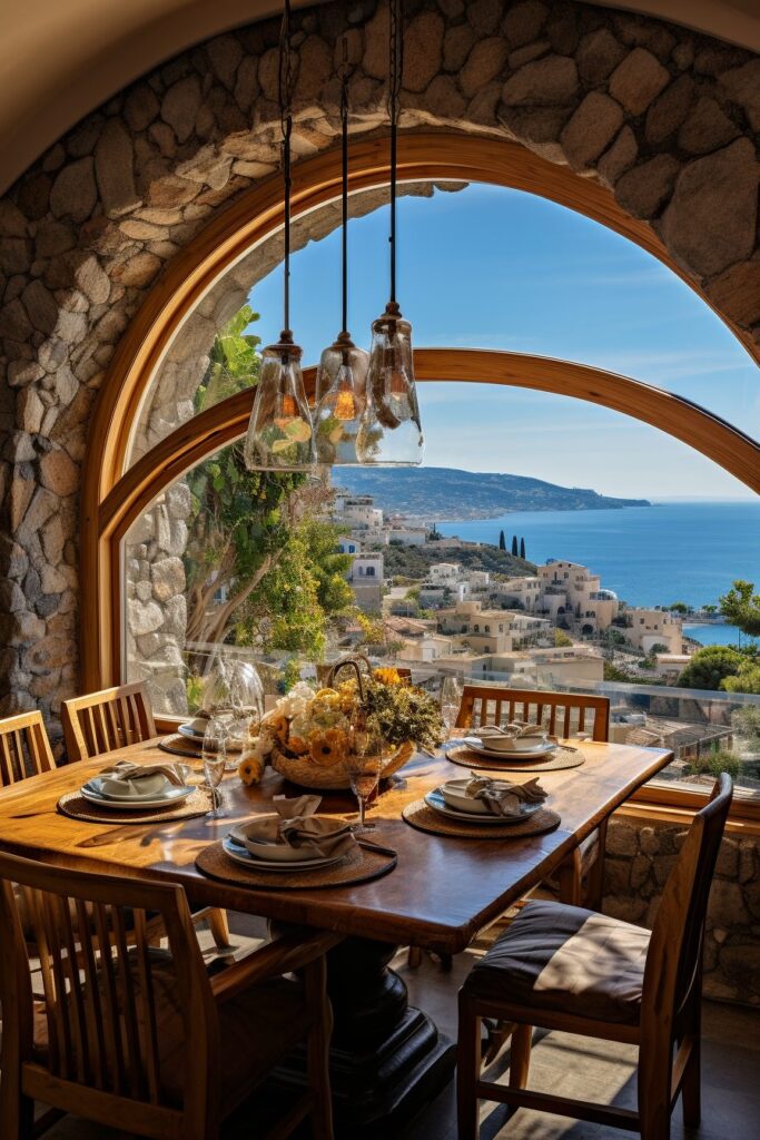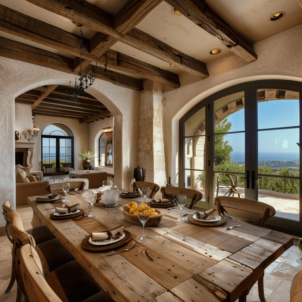 15: Full luxury editorial shot of a modern Mediterranean dining room.